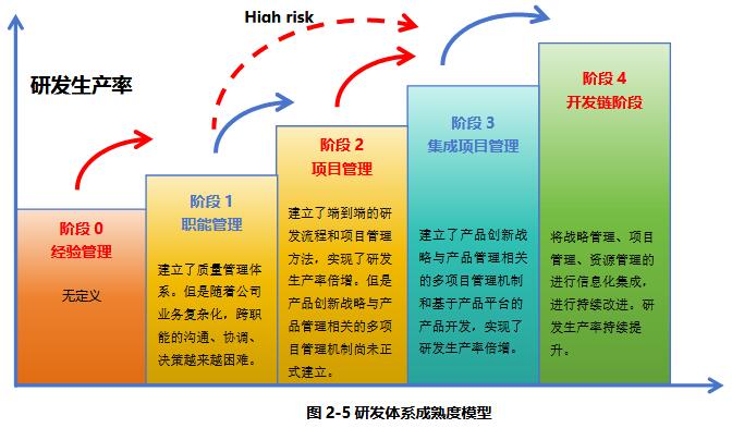 体现了研发体系改进的规律,为实施研发体系变革提供了指引。按照阶段递进的方式实施变革,可以降低风险,快速获得阶段性的投资收益。而每一个阶段的成功实施也为发展到下一个阶段奠定了基础。